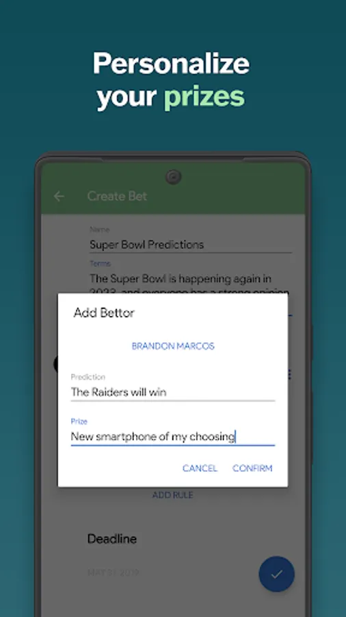 With Wager, making funny new bets for private use or to share with the social community is an incredibly smooth experience. Describe your bet, add your friends with their guesses and desired prizes, set a deadline for when the bet is finished, jot down any edge cases as rules for the bet in case things go astray, and upload photographic evidence (so nobody weasels out of their committments later)!