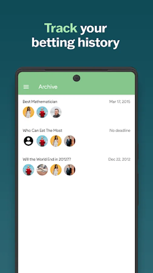 Wager is a lifesaver in managing your bets! When a bet deadline is reached you will receive a push notification reminder to close it out. After you mark a bet completed, track the winner of the bet and who did or did not fulfill their obligations! Have a ton of fun viewing your history of bets and basking in the glory of how often your guesses have been correct in the past.