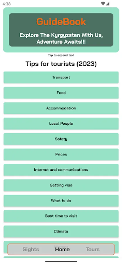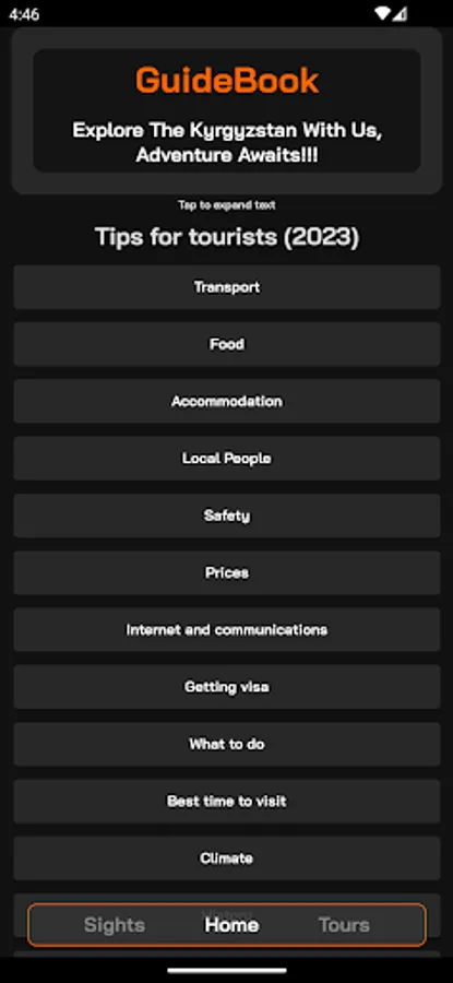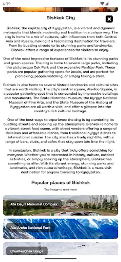 Our Android app is your ultimate guide to the most popular tourist destinations in the country. Discover the best places to see and visit during your stay, even when you're offline. With our app, you can easily navigate and plan your route to make the most of your time in Kyrgyzstan.