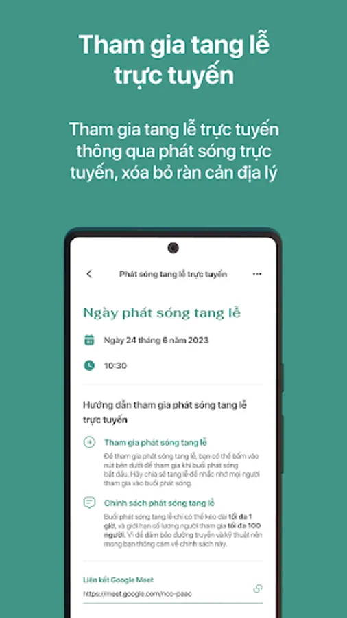 The application provides online funeral services, allowing you to celebrate and remember the deceased in a solemn and respectful way. Using live video, you can connect with family and friends far away to share thanks and memories of your loved one.
