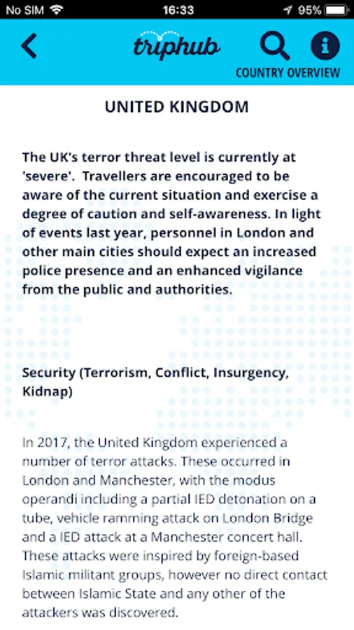 TripHub provides a consolidated resource of risk intelligence for all countries and major cities around the world; focussing on facts that can be depended on to support business travellers in unfamiliar environments. Subscribers can speedily research information that includes: