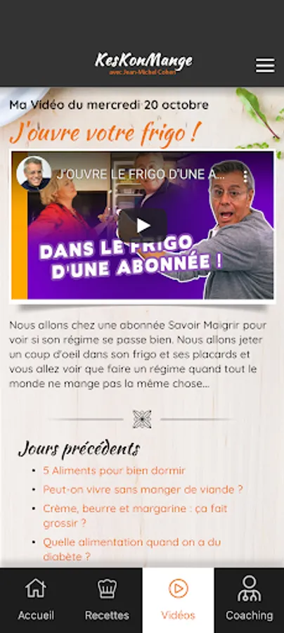Tous les jours de l’année (même le dimanche), Dr Jean-Michel Cohen vous propose un menu sain et diététique, une recette légère et savoureuse et une astuce pratique sur la nutrition.