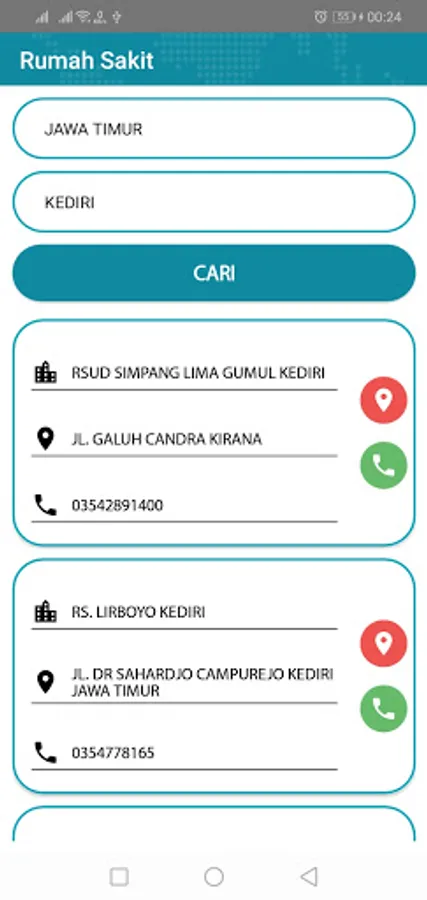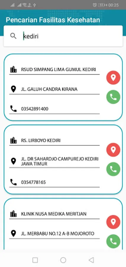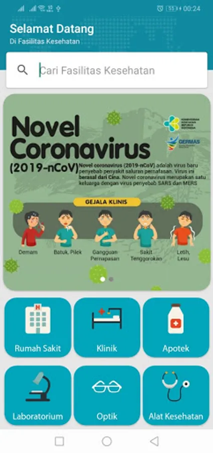 List of health facilities throughout Indonesia such as Hospital Facilities, Clinics, Pharmacies, Laboratories, Optics and Medical Devices. Displays data based on the selected Province and City. The information provided is in the form of Health Facility Name, Health Facility Address, and Health Facility Phone Number. There is a feature to go to the location of Health Facilities using Google Map.