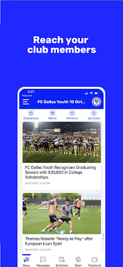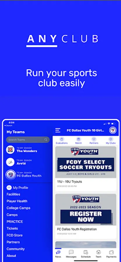 The AnyClub app is for sports teams and clubs that allows players to register, pay, get evaluated, and access all club and team-related content.