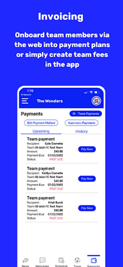 • Payment Processing: AnyClub has partnered with Stripe for secured and fast payment processing. Clubs can onboard team members by creating payment plans they can choose. Teams can invoice team members individually or as a team. All payments can be made in app or via the web based site.