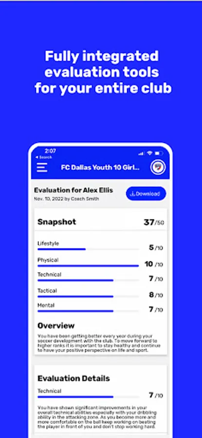 • Player Evaluations: Easily create custom evaluation templates to use for your teams. Coach and Player communication happens throughout the evaluation process. Parents can see where their players are excelling and where they need to focus.