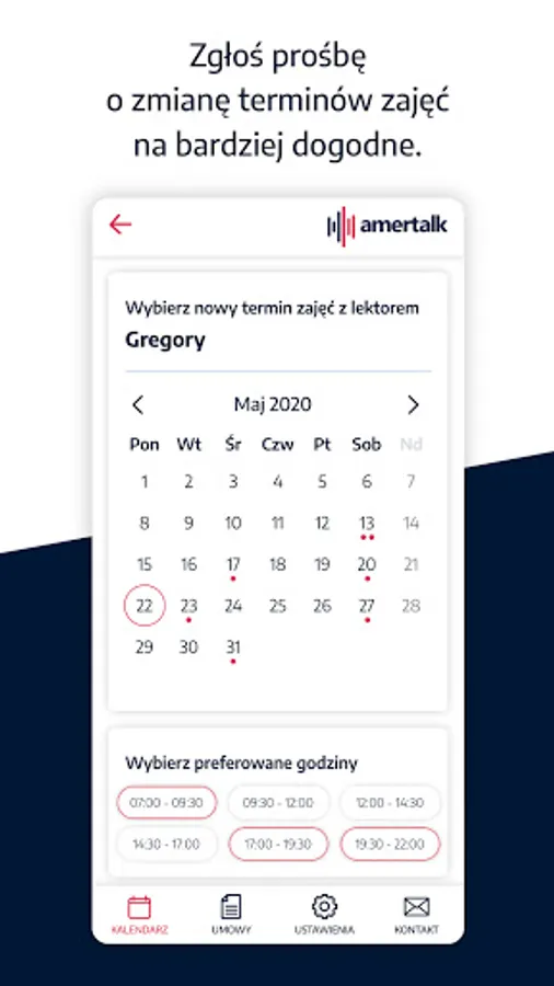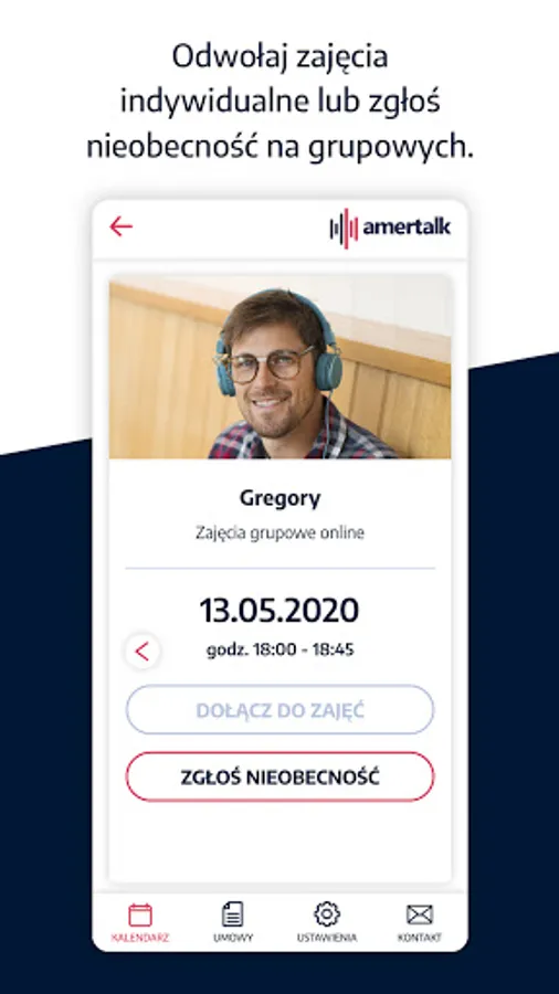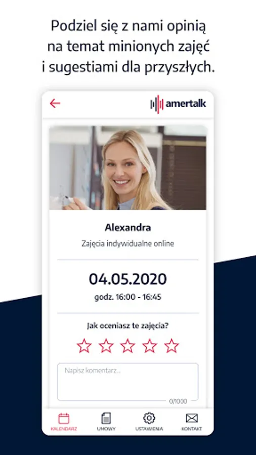 From now on, you will always have your schedule at hand, and you will find all the classes and their details in the Amertalk calendar. In the app, you can join online classes with american teacher without access to computer. Additionaly, you can rate every single lesson and submit a break or request the date change.