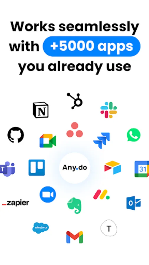 Any.do To do list, Calendar, planner & Reminders Integrates with Google Calendar, Outlook, WhatsApp, Slack, Gmail, Google Tasks, Evernote, Trello, Wunderlist, Todoist, Zapier, Asana, Microsoft to-do, Salesforce, OneNote, Google Assistant, Amazon Alexa, Office 365, Exchange, Jira & More.
