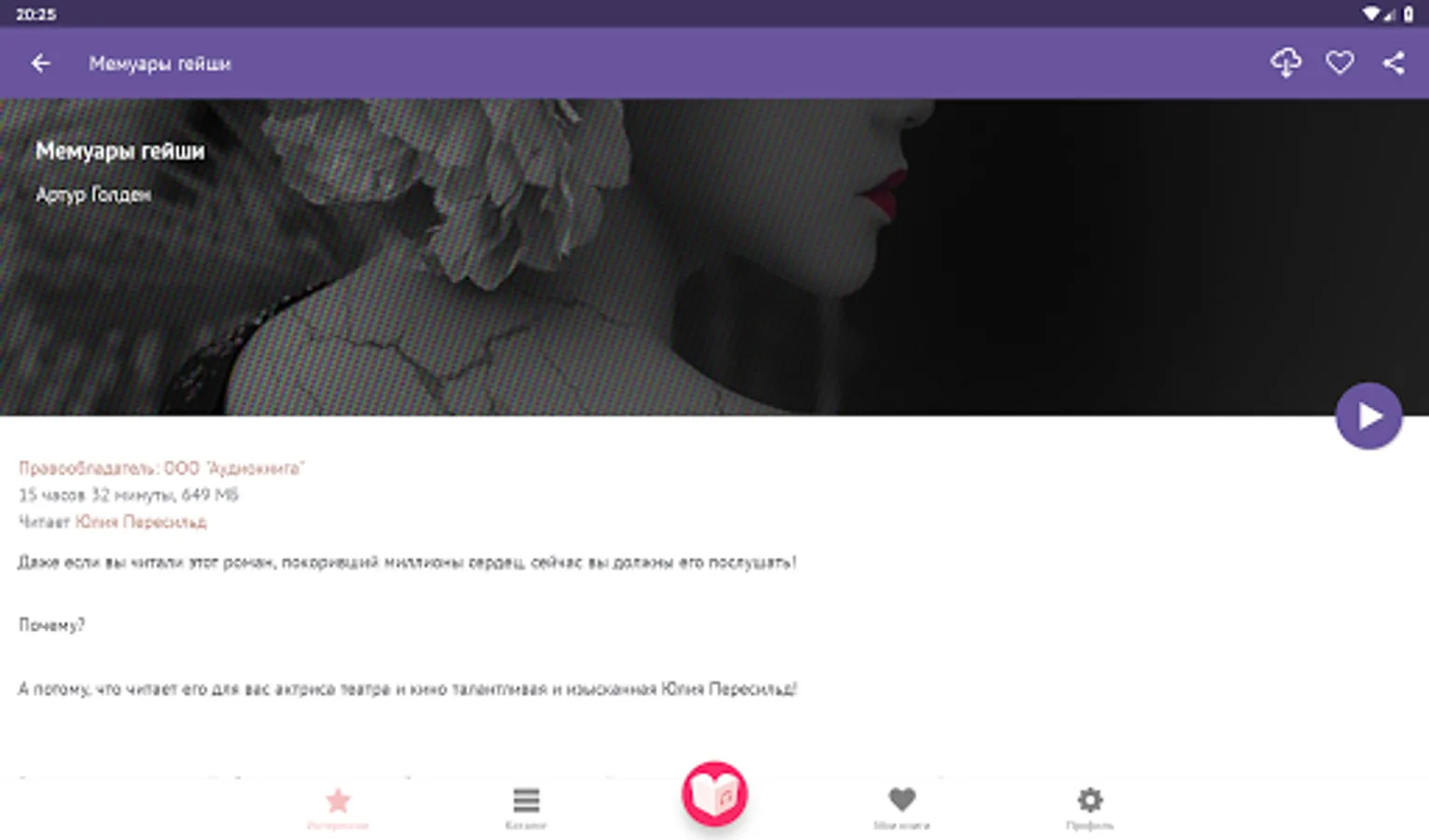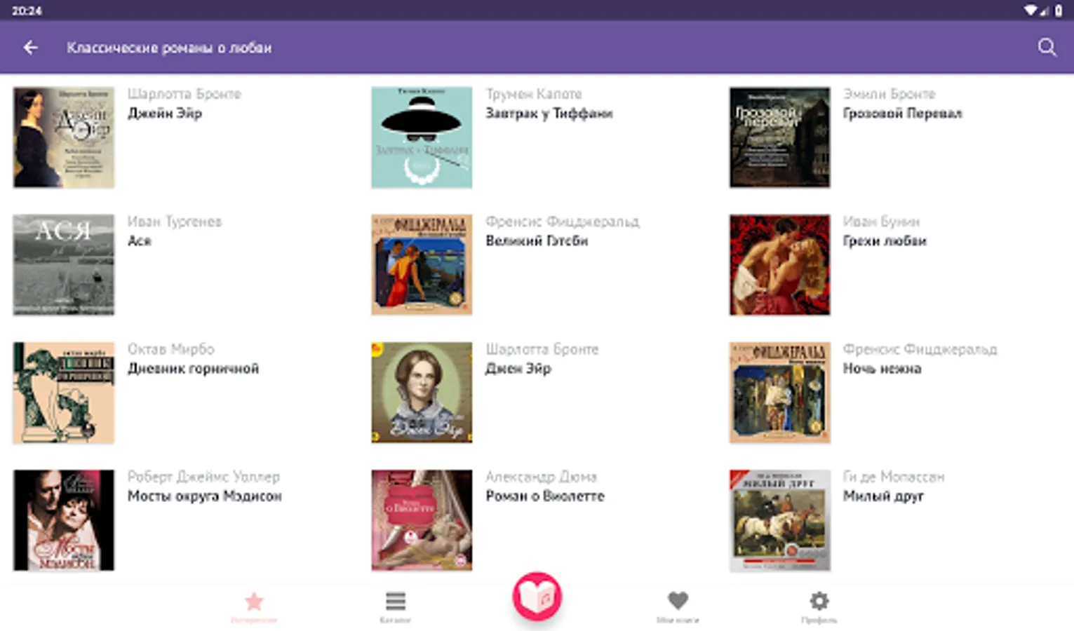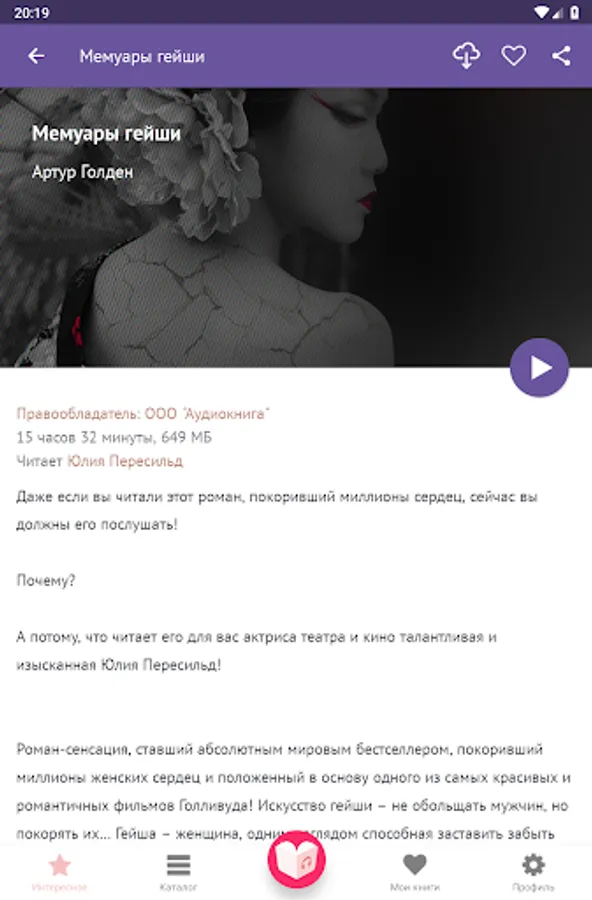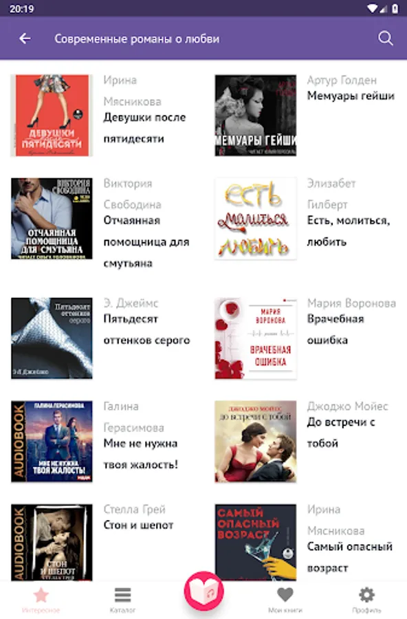 “Tomorrow at Tiffany”, “Thunderstorm Pass”, “Eat, Pray, Love”, “Jane Eyre”, “Sins of Love”, “Maid's Diary”, “Night is Tender”, “Confession of a Woman”, “Dangerous Liaisons” - and this is just the beginning of an endless list. The most recent, popular and interesting books appear every day in the library. We have the authors: Truman Capote, Emily Bronte, Elizabeth Gilbert, Francis Fitzgerald, Ivan Bunin, Alexander Dumas, Guy de Maupassant, Marquis de Sade, Jane Austen, E.L. James - and many others. With our application, the most popular books and long-awaited audio news can be listened to for free!