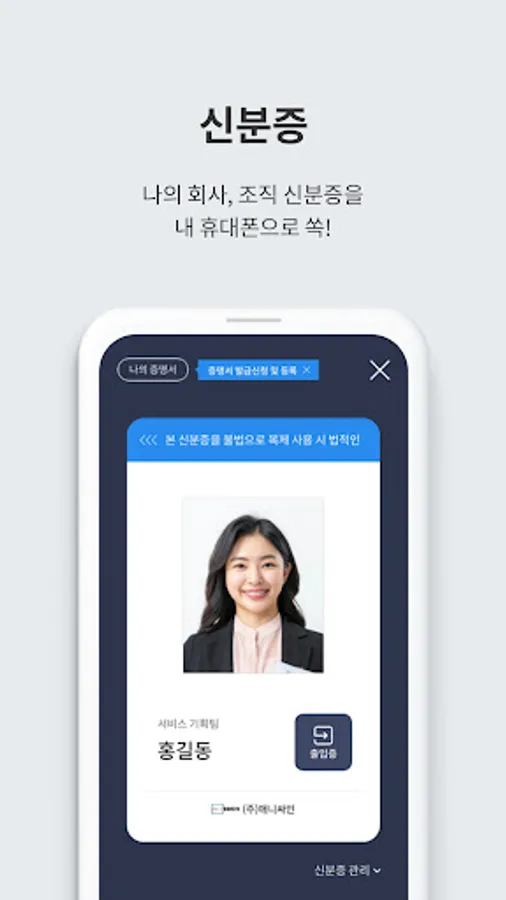- Convenient QR code authentication: QR code with authentication technology is issued for personal and corporate authentication. Individuals can check in with a QR code that can prove their identity when checking in or out, and companies can manage access and employee commuting with the company's representative QR code.
