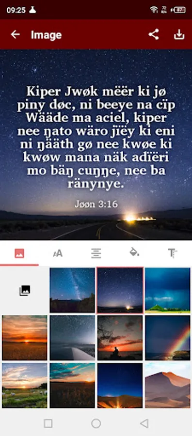• When you tap on a verse, an image button is shown on the bottom toolbar. When this button is pressed, the ’Edit image’ screen appears. You can choose the background image, move the text around the image, change the font, text size, alignment, format and colour. The finished image can be saved to the device and shared with others.
