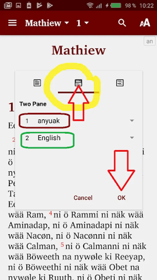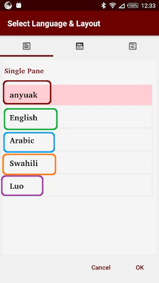 - "two panes" to display the Anuak at the top and the English (or Arabic, or Swahili, or Luo) version at the bottom