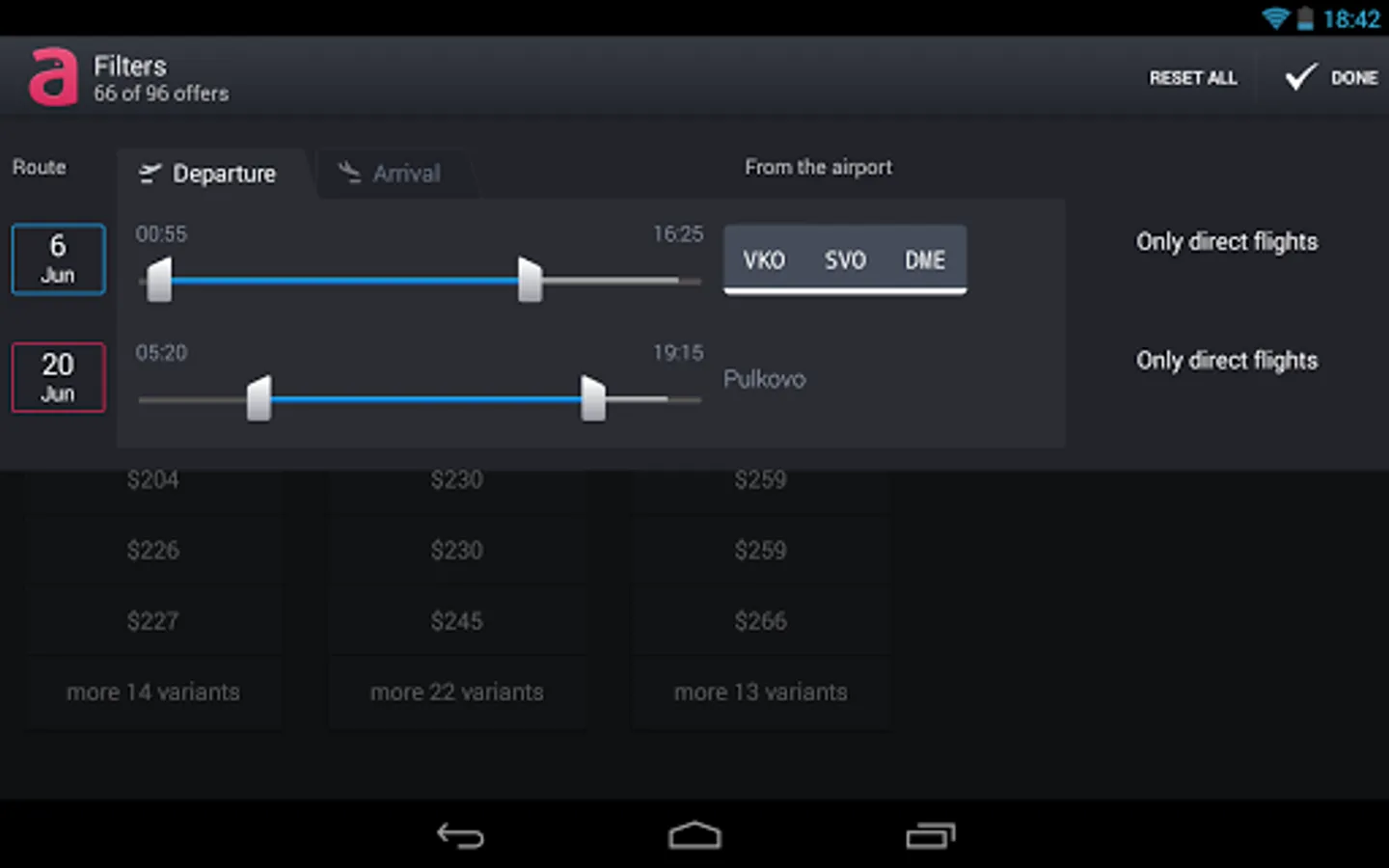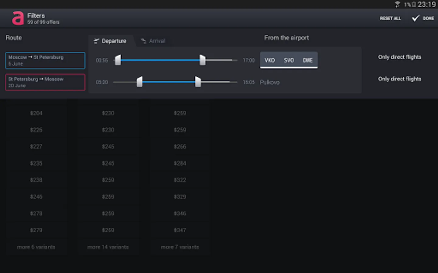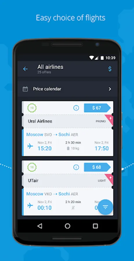 • Comes with filters. Exclude avia offers by price, time of departure or arrival, travel time, airlines, airports, number of connections, class of service, and find the one that's perfect for you. As for the time spent at your destination, you can select from a variety of hotels, filtering them by type, star rating and on-site amenities.