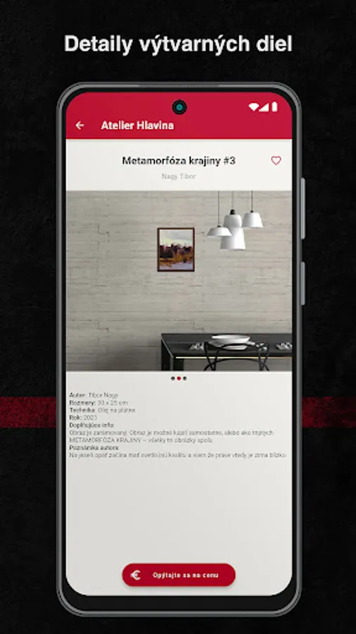 Umenie do vrecka - is an art gallery that you can visit at any time. It is designed for leisure time by viewing works of art of various kinds 24/7. The application presents contemporary Slovak and Czech fine art by artists who are associated under the ATELIER HLAVINA Gallery project. When using the application, you can view the pieces themselves, or find out basic information about the work with one click, then you will get an idea of how the piece can work in the interior. If you like the piece, you can save it as a favourite and return to it at any time. You can filter works according to artists, or according to technique or focus. From the application, it is possible to start communication with the gallery with one click, who will send you information about the current availability and/or the price of the work you are interested in. This communication takes place at the level of personal contact by e-mail or subsequently by telephone.