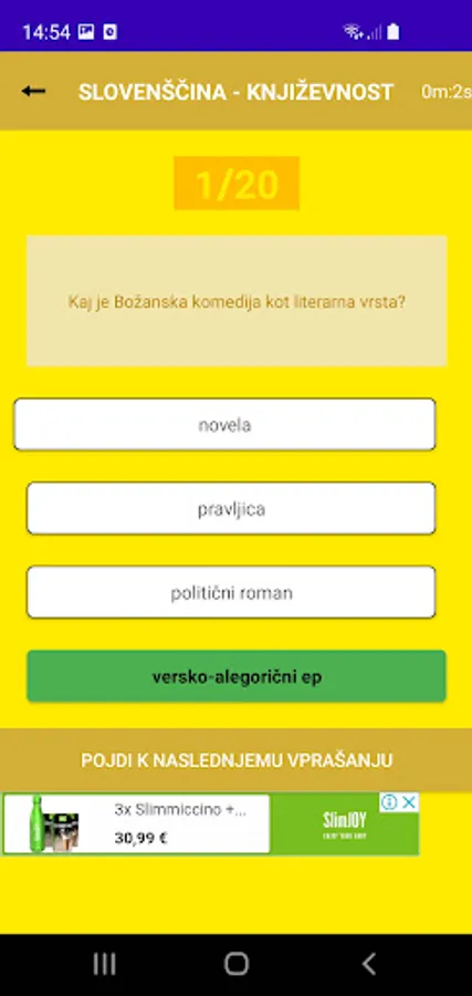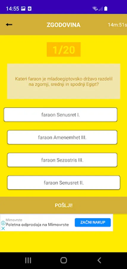 Quiz version 1.0 contains carefully collected questions from the subjects of Slovenian at the oral matriculation exam and from history. The Slovenian subject contains about 200 different questions and the history subject contains about 150 different questions.