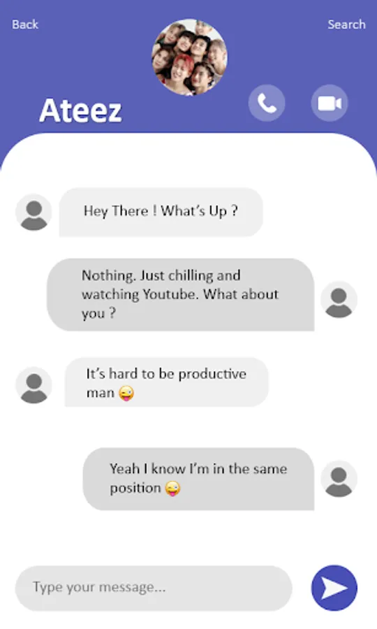 Ateez is a South Korean boy band formed by KQ Entertainment. The group consists of eight members: Hongjoong, Seonghwa, Yunho, Yeosang, San, Mingi, Wooyoung and Jongho. Kim Hongjoong is leader, rapper and composer of this group. My Fake video call and chat app allow users to dail prank call with any of the member of Ateez band. This application consists of Fake call Kim Hongjoong, Fake call Seonghwa, Fake call Yunho, Fake call Yeosang, Fake call San, Mingi, Wooyoung and Jongho.