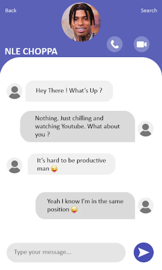 With NLE Choppa prank call you can receive a fake call simulate a real voice of NLE Choppa call and also simulate a real video of NLE Choppa Call, using this app to have a fun time is very good because to call NLE Choppa fake call, that makes a very funny moment with your friends, and also you have the option to receive a call and prank you friend within X Second, and that shows them that you receive calls from NLE Choppa, and after that tell the that is just a joke app simulate a fake call from NLE Choppa game, you can tell your friends and advice them to install this app too ,they will receive a funny call from NLE Choppa, and they will do the same thing using NLE Choppa app, and pranking their friends.