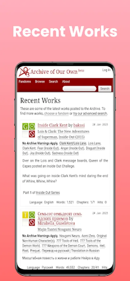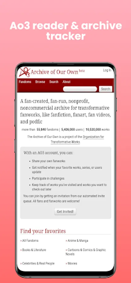 DISCLAIMER: THIS IS NOT AN OFFICIAL APP. We are not affiliated with Archiveofourown.org, this app is developed by Archive of Our Own (AO3) fan for AO3 Android users.