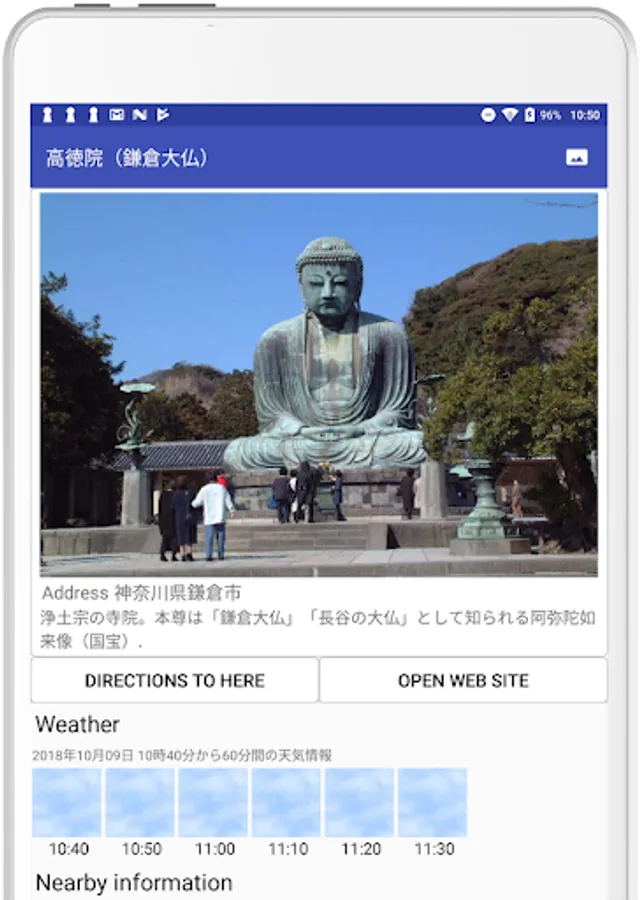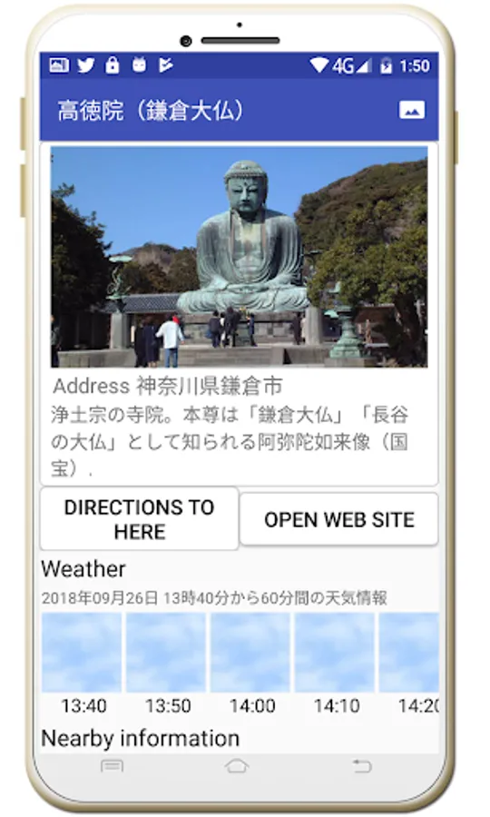 3) With the help from the Web Service of Yahoo! Japan, I also can find the nearby information of a tourist spot such as weather, gourmet(if there is a coupon, a red button will be display, you can tap it to open coupon page), hotel, taxi, and so on. (Online is a must)