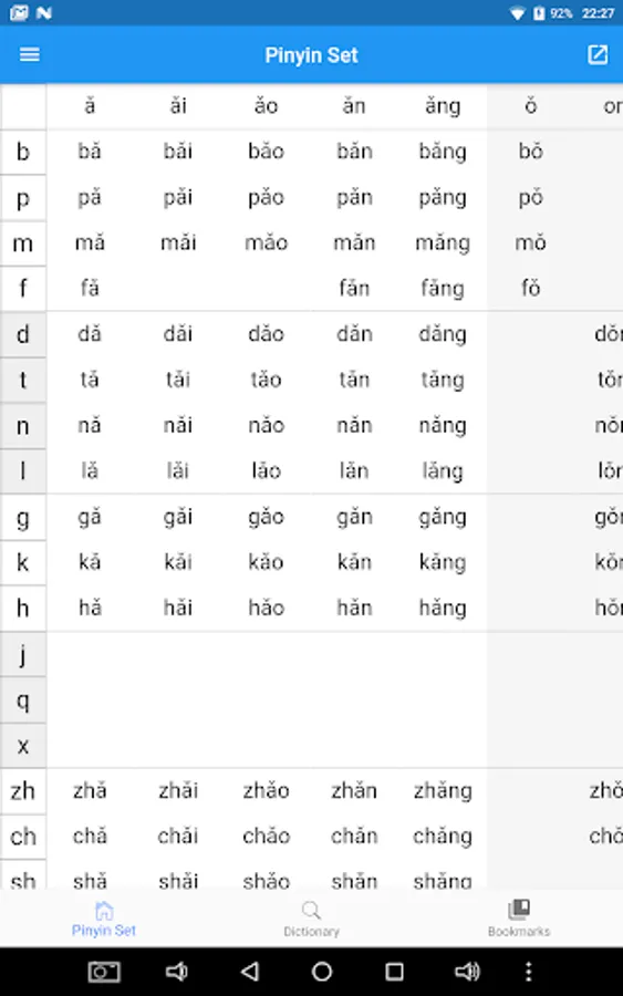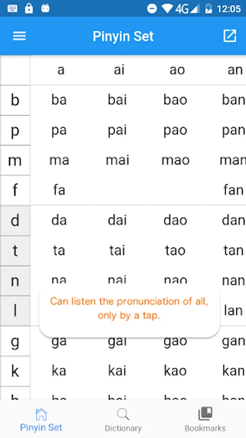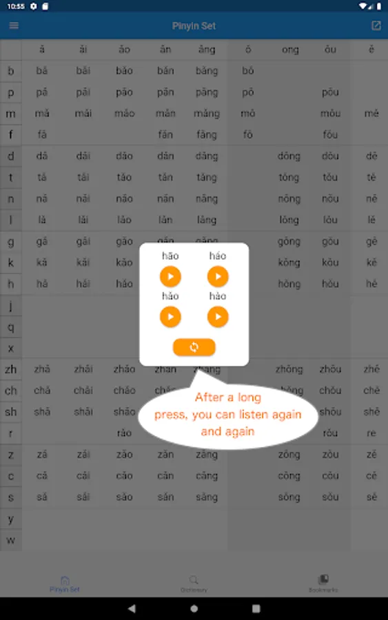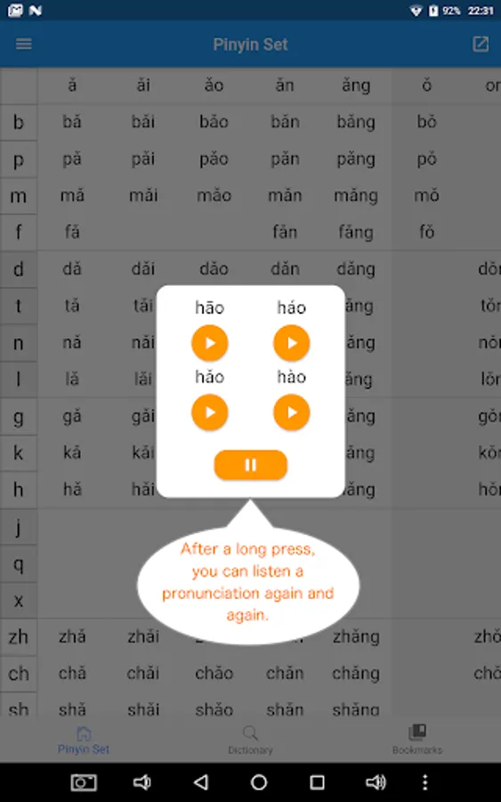1, Contains all the Pinyin pronunciation set, especially you can listen all of them with only one TAP.