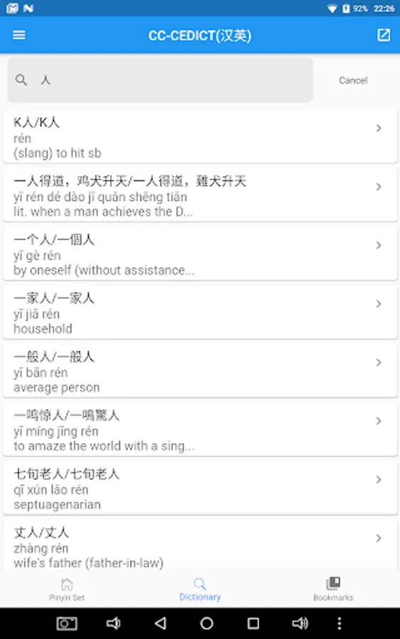 2, Bundled with offline three language dictionaries, CC-CEDICT(汉英), HanDeDict(汉德) and CFDICT(汉法)。You can listen to the pronunciation of every Chinese character in the dictionaries.