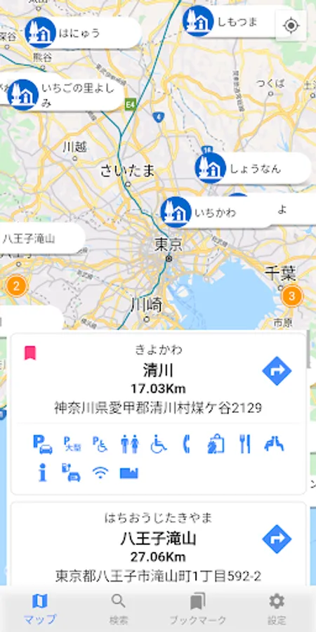 (The number written on the orange round icon is the number of roadside stations in that area.)