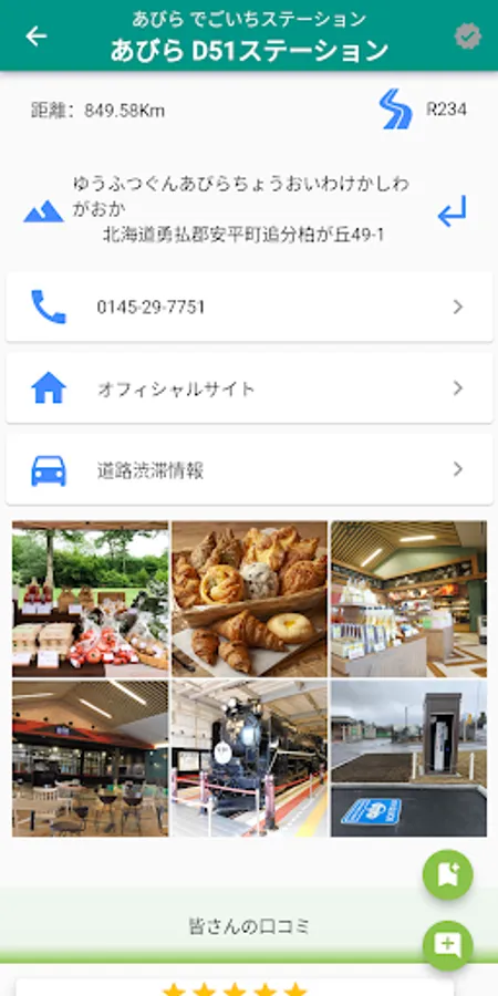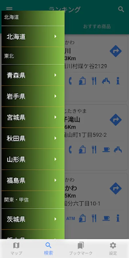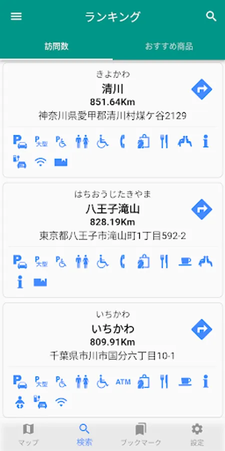 Facility information, distance from current location, directions to here (linked with map app), street view, official website, nearby roadside stations, specialty products (only if posted), etc.