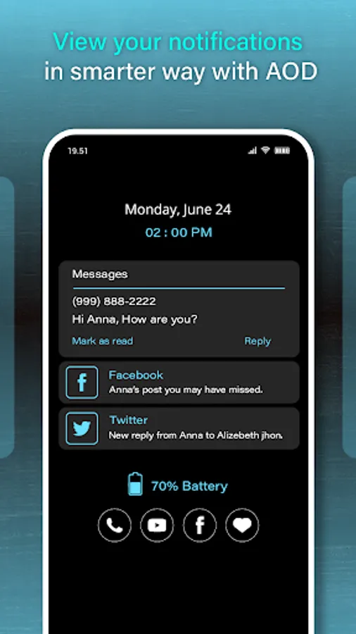 New ⌚Always on Display app that is design to display some necessary information like Time, Date Notification Calendar Custom Text Custom Images from your Gallery Messages notifications Social Media Notifications Battery Level and much more...