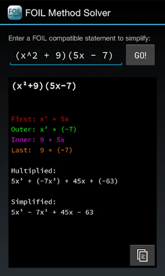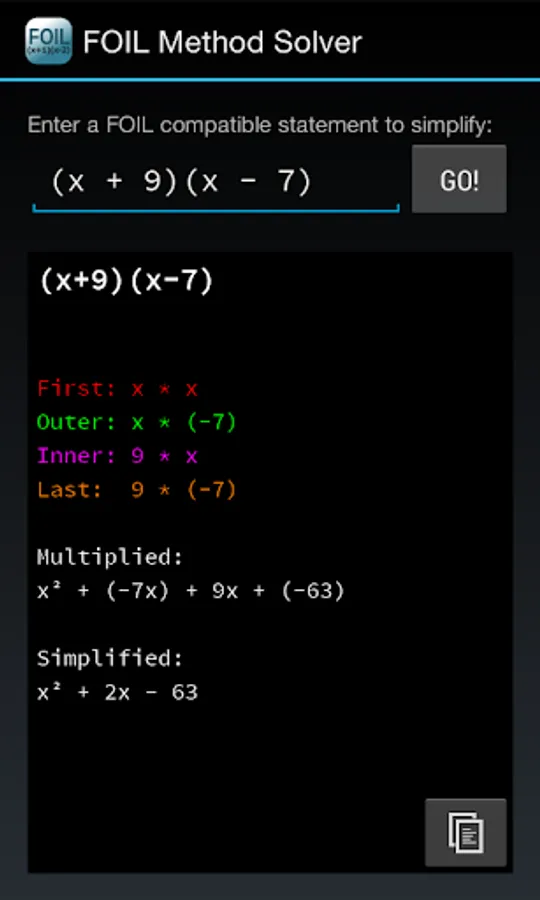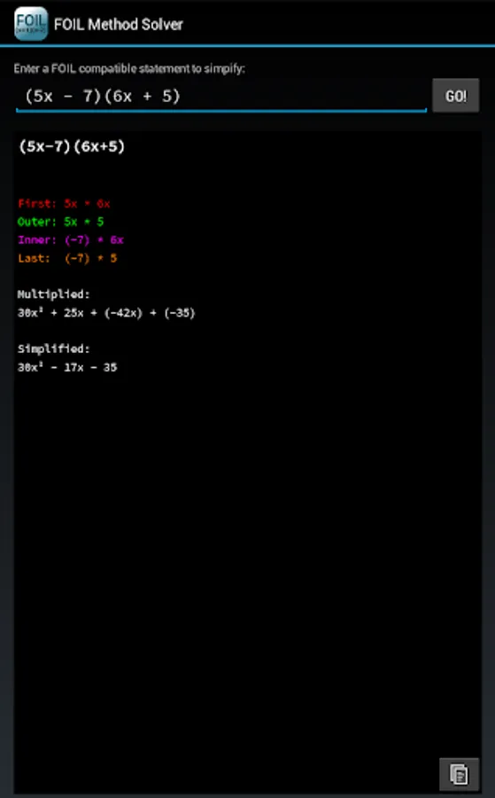 The FOIL method is a special case of a more general method for multiplying algebraic expressions using the distributive law. This app will only work in this special case.