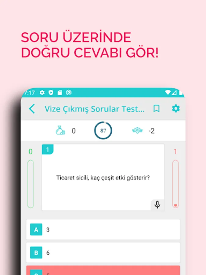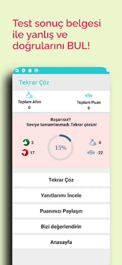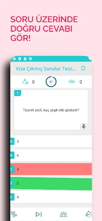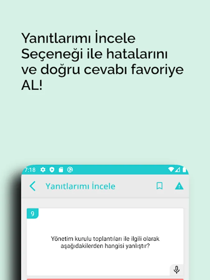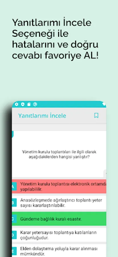 In the Issued Questions material, there are mixed multiple-choice questions and there is a midterm or final option. The number of correct and incorrect answers can be seen at the end of the exam. In addition, you can access your past practice exams from the main menu in order to evaluate your exam performance and monitor your progress. You can also view your answers to all individual questions and review which questions you answered correctly and incorrectly. You can solve the questions you want by adding them to your favorites.