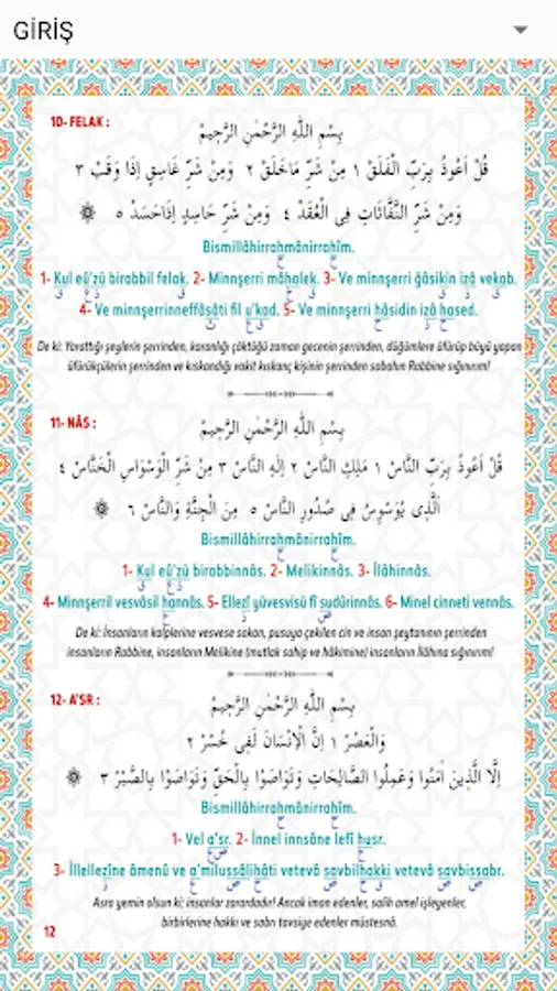 Fatiha, Elephant, Kurayş, Mahogany, Kawthar, the infidels, Nasir Tebbet, Ihlas, Felak, Nas, Asr