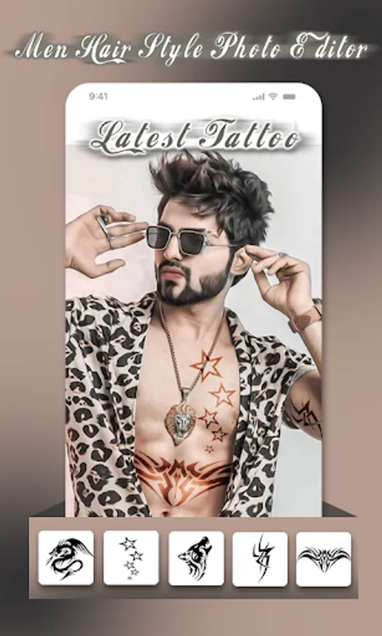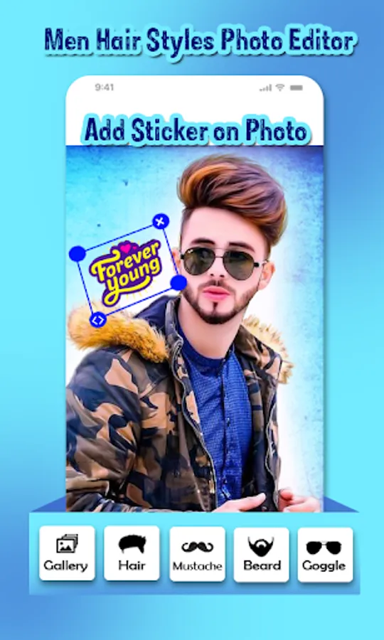 Install this free to download men photo editor with hairstyle, beard, mustache, goggles, tattoo app. Select an image from mobile gallery and start applying various stickers on your photo. Save it and use it