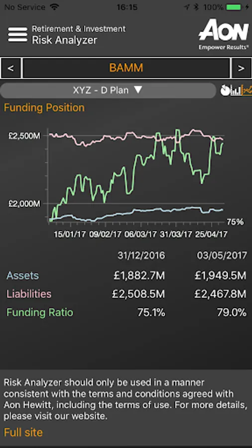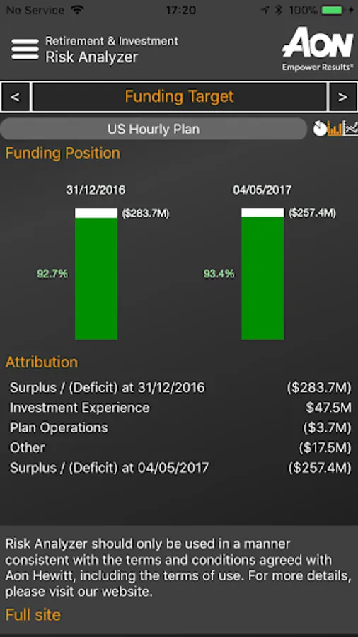 Aon Hewitt has brought its investment and actuarial expertise together to create a fully integrated real-time valuation and risk management system for pension schemes: Risk Analyzer. This powerful easy to use tool strengthens sponsors’ and trustees’ ability to understand, manage and more importantly take immediate action in relation to their pension schemes. Risk Analyzer provides a simple integrated pension risk management platform showing daily funding analysis and risk metrics.