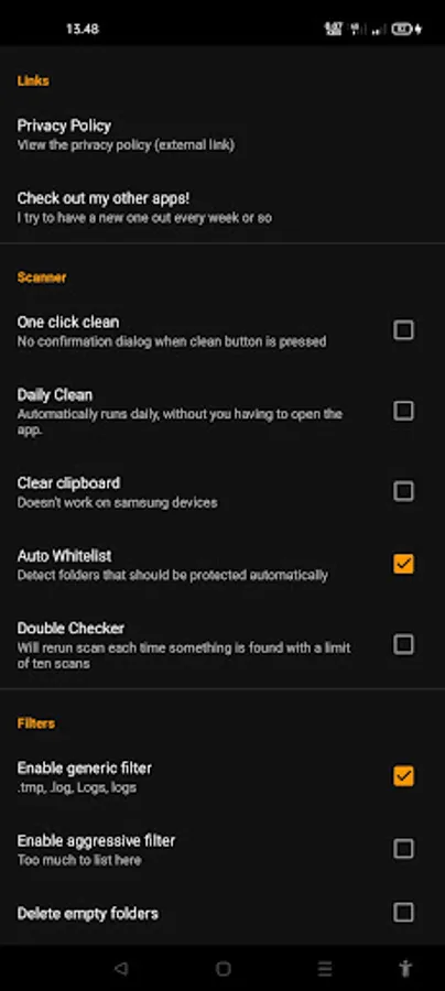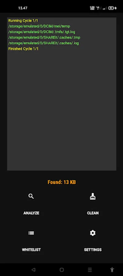AOne Cleaner only aims to clean your phone by removing safe to delete files, which not only frees up a lot of space, but also improve your privacy. Since AOne Cleaner removes .log files, which well, log what you do.
