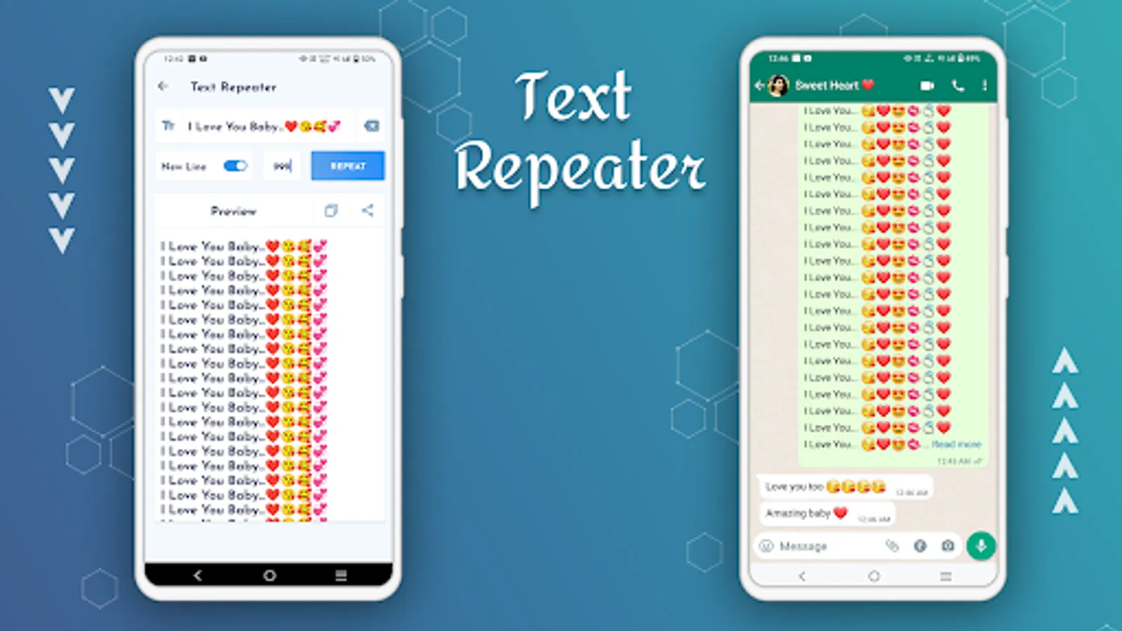 Text Repeater for Whatsapp Unlimited : This is text repeater pro app for repeat text for social media, chat & text repeater for whatsapp unlimited. Send as many texts as you want with a fast and easy Text Repeater.