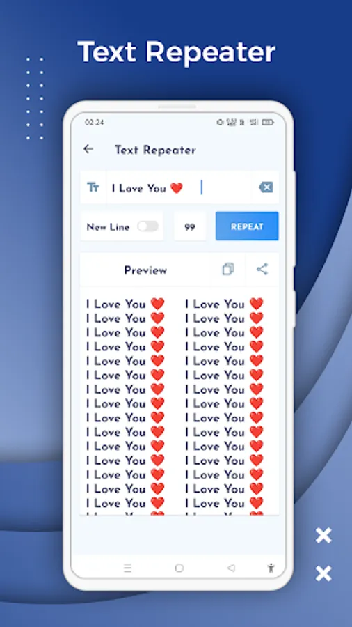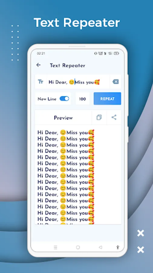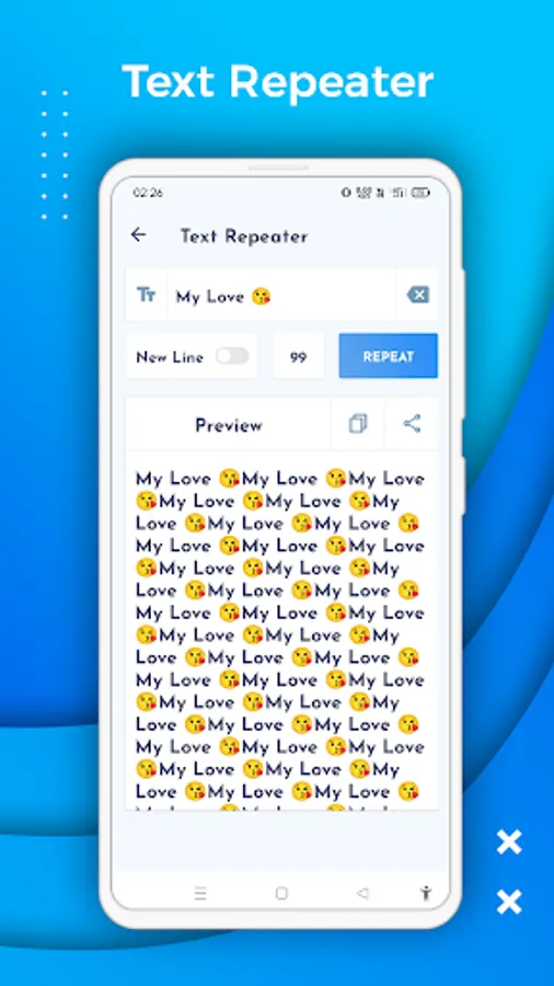 Message & Text Repeat Bomber app that lets you generate and copy a piece of text or a word multiple times within a seconds.