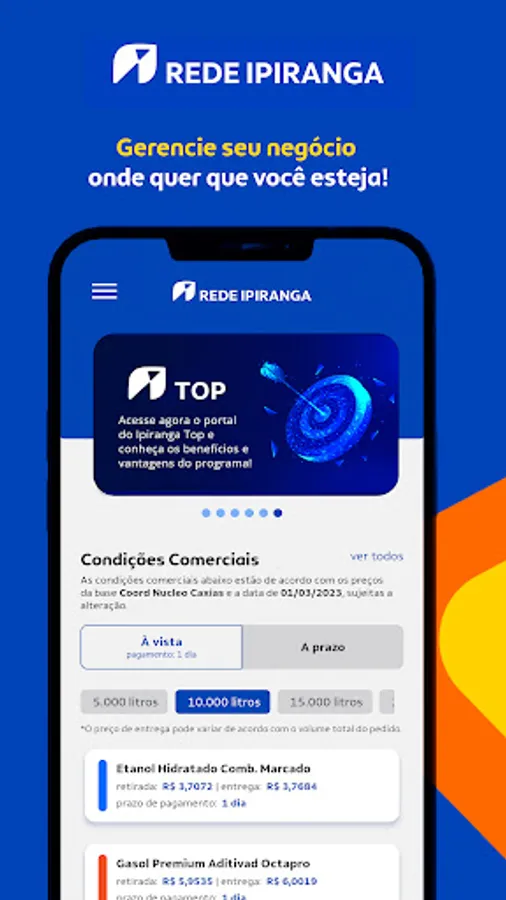 With the application, our customers can carry out and follow the status of their orders, consult the commercial conditions, send proof of payment and follow the information of the overdue and due securities in the current account area. But does not stop there! In the Rede Ipiranga App you can also update your registration information, access the Ipiranga Partner program and Ipiranga TOP, in addition to being able to request service via WhatsApp.