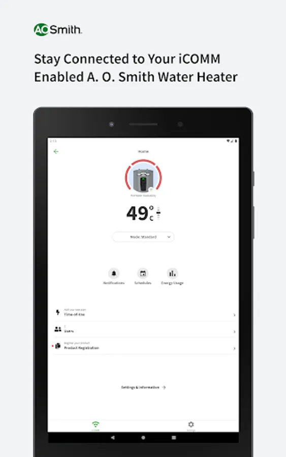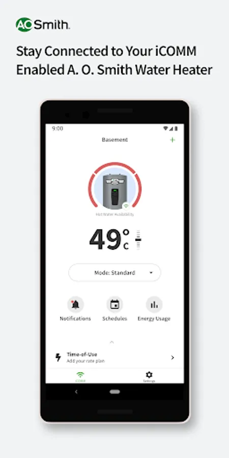With constant remote monitoring the A. O. Smith Mobile App features the iCOMM™ connectivity platform, the latest technology for remote water heater management.