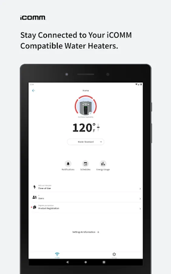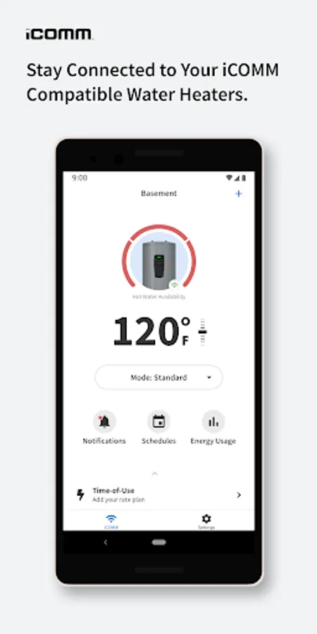 Through an easy setup process, connect all your iCOMM™ enabled water heaters to the app. Once connected, you’ll gain access to diagnostic fault notifications, settings for your water heaters and much more.