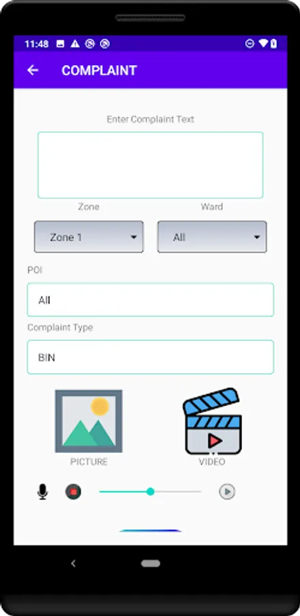 The app enables citizen to capture picture, video and audio, related to Garbage condition in their area, which gets linked to their complaint at backend.