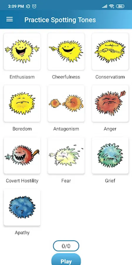 You can select the various attitudes and watch and listen to the animations to get a familiarity with each different emotion.
