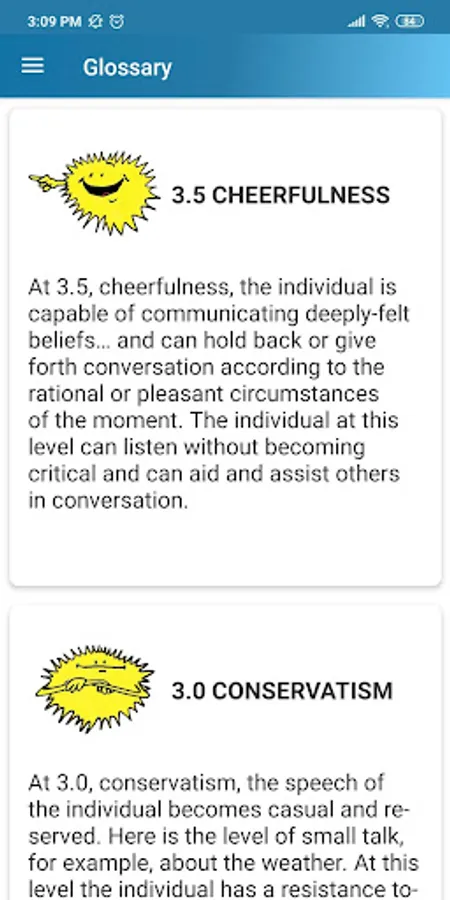 - Ten different emotions/attitudes: Apathy, Grief, Fear, Covert Hostility, Anger, Antagonism, Boredom, Conservatism, Cheerful and Enthusiasm.