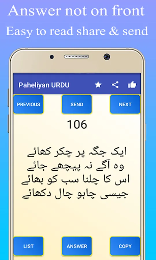 This is paheliyan urdu Riddles application with paheli game to guess the riddles paheliyan bujho to jane paheli wali game.