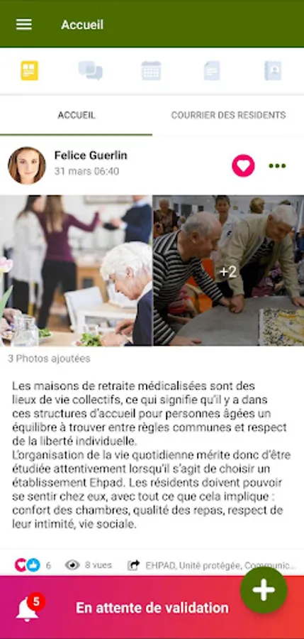 With Apajh you stay informed about the daily life of your loved one within the Apajh establishment. The team shares with you the social life of the residence through a news feed containing photos and videos of activities, weekly menus, documents and everything that allows you to be as close as possible to your near in residence.