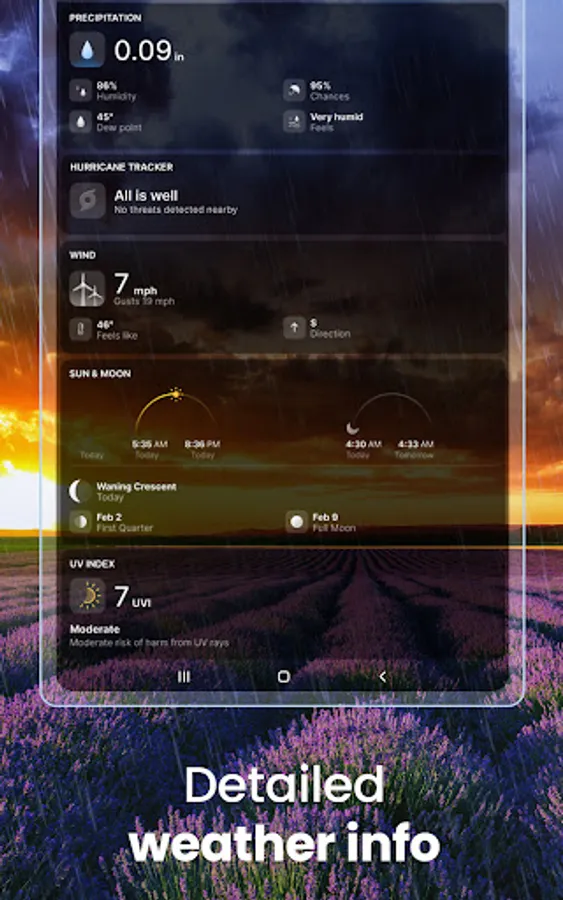 Please note that some supplementary features and weather details in the basic version are subject to limitations (ex. UV index, 14-day weather forecast, Sun and Moon, Lightning tracker, Visibility, Air Quality Index, Weather widget, etc.). These limitations are also subject to change.