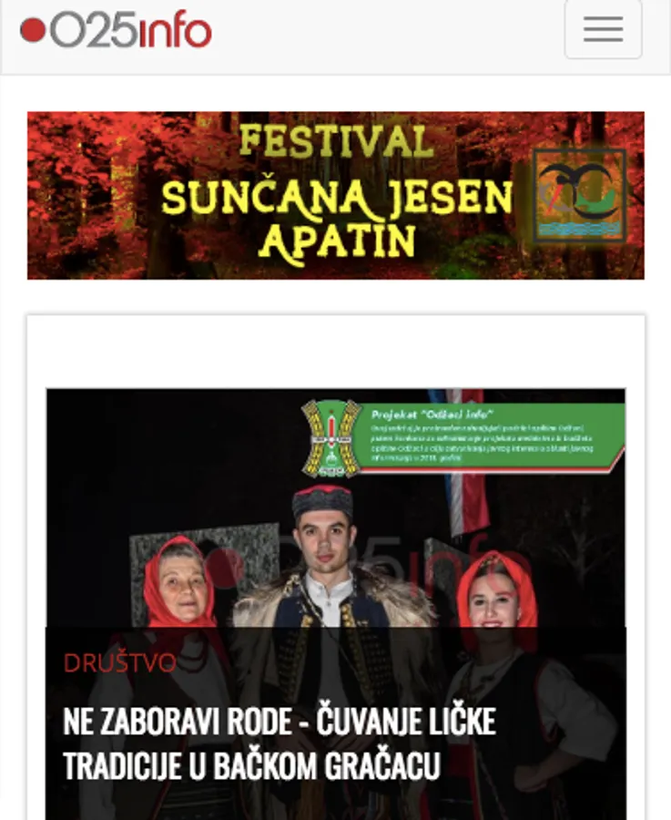 025info.rs je informativni portal iza čijeg se uspeha nalazi tim mladih ljudi koji imaju jedan zajednički cilj - tačna, brza i korisna informacija. Naš portal sadrži najvažnije i najatraktivnije informacije Zapadno-bačkog okruga, koje su namenjene stanovnicima Apatina, Sombora, Kule, Odžaka i sela pomenutih gradova. Kako je internet najvažniji medij današnjice, 025info, povezan sa društvenim mrežama, pruža mogućnost da sve što vas zanima saznate prvi.