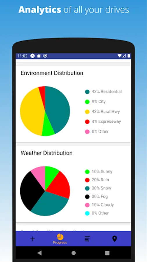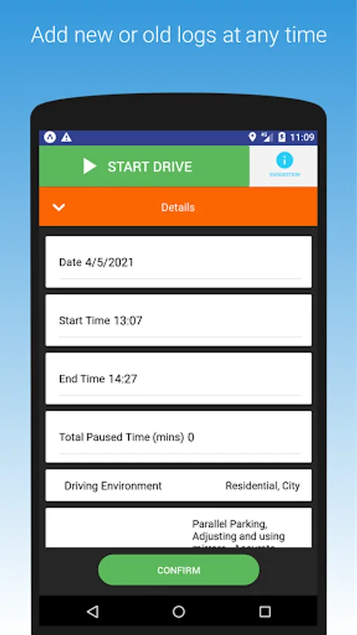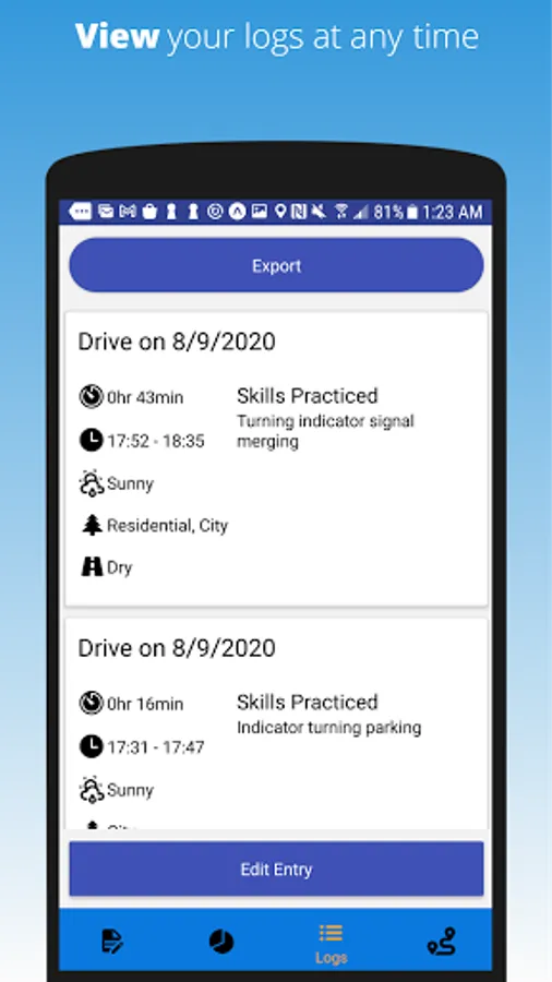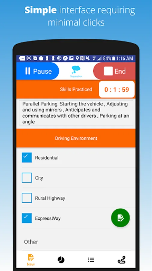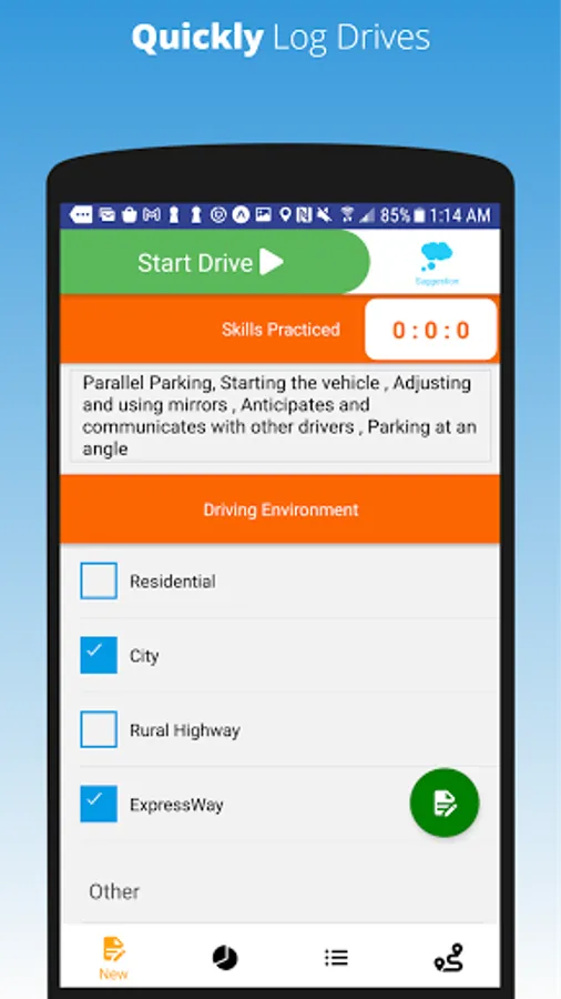 This app can help driver's log their driving progress and target specific driving skills with the following features: