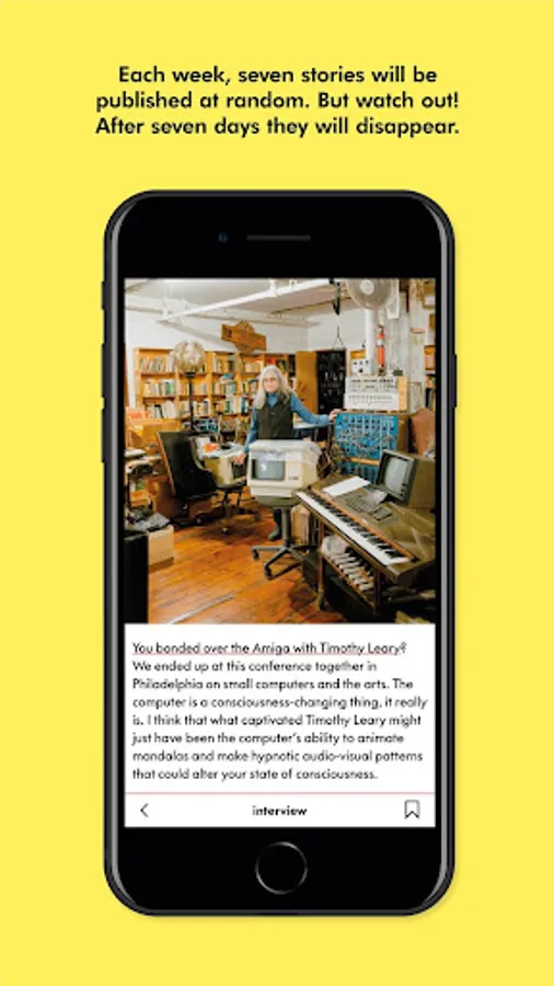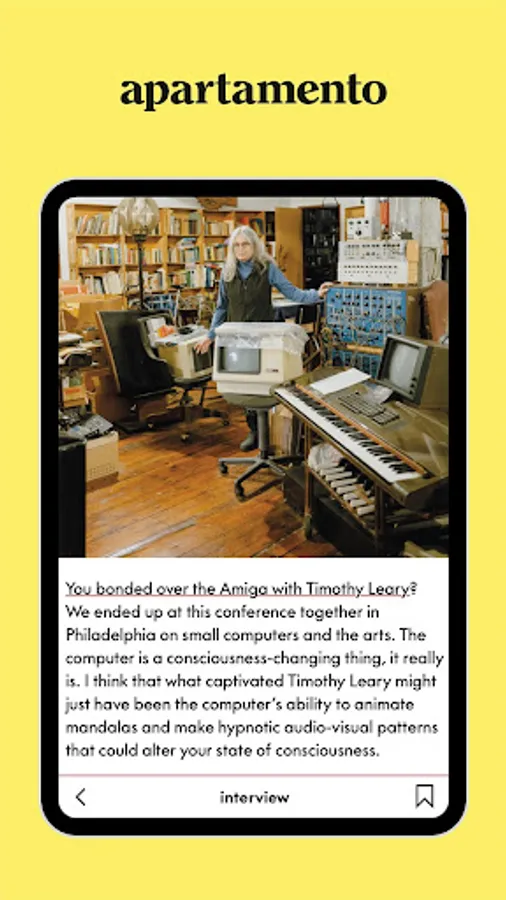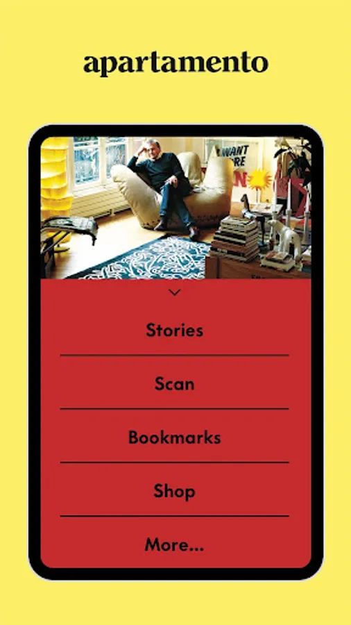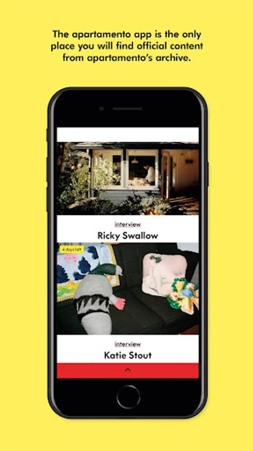 The apartamento app is the only place to find official content from apartamento magazine’s archive. Each week, seven stories from the entire apartamento archive will be published at random. You will have a time limit of seven days to access these stories before they are wiped from the app and replaced with seven more.
