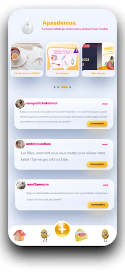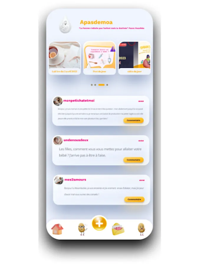 With Apasdemoa, you will find a community of mothers and future mothers ready to share their experiences, advice and tips. Whether it's to start breastfeeding, during the Milky Way, returning to work while breastfeeding, the sleep of a breastfed baby, weaning or everyday life with your breastfed little one, Apasdemoa allows you to discuss and feel supported in all circumstances.