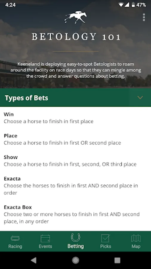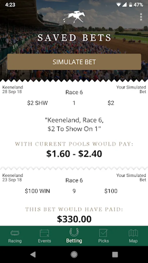 Use the Bet Simulator to calculate and save your bets on your phone so you know how much they cost and you’ll be prepared to place your bets when you get to the window.